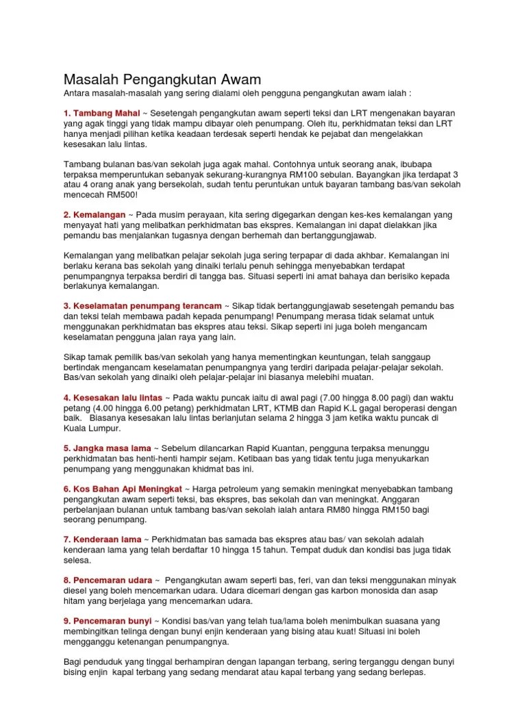 Perkhidmatan pengangkutan awam yang baik . Langkah ini dapat mengurangkan masalah pencemaran udara terutamanya di . Setiap isu pasti ada langkah langkah cadangan penambahbaikan . Contoh karangan spm masalah pengangkutan awam dan cara mengatasi pengangkutan awam penting dalam kehidupan manusia. Dengan cara ini jumlah kenderaan di atas jalan raya dapat dikurangkan seterusnya mengurangkan pencemaran udara dan kesesakan lalu lintas.